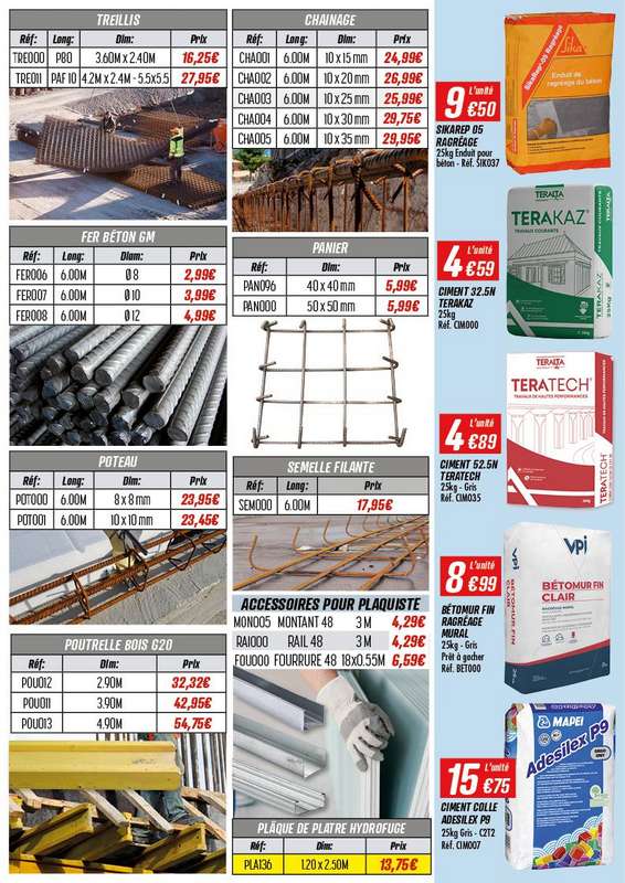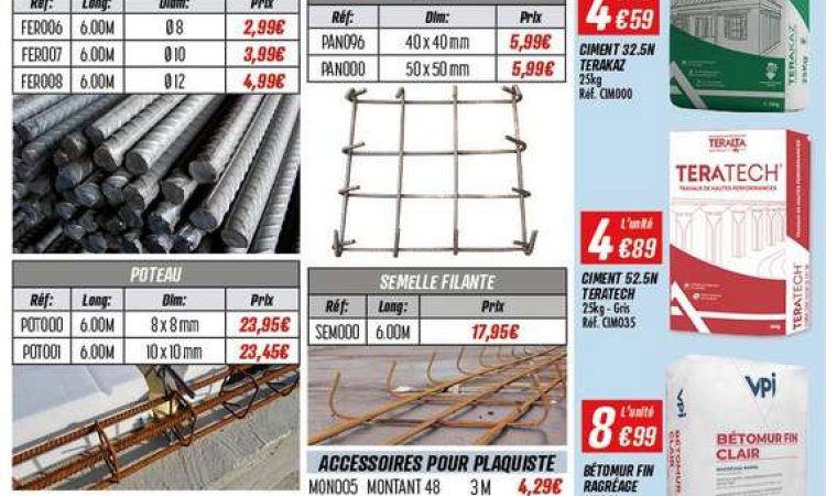 - Construction / gros œuvre : fer à béton, treillis soudés, semelles filantes, poteaux.