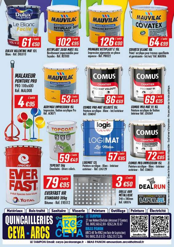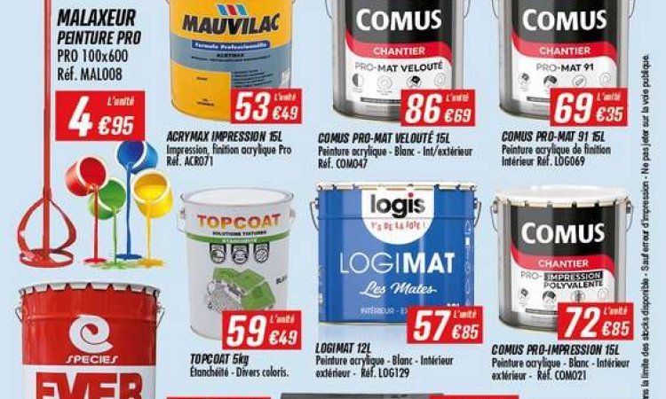 - Peinture et produits techniques : peintures professionnelles( Mauvilac, Comus, Dulux Valentine), produits d’étanchéité.